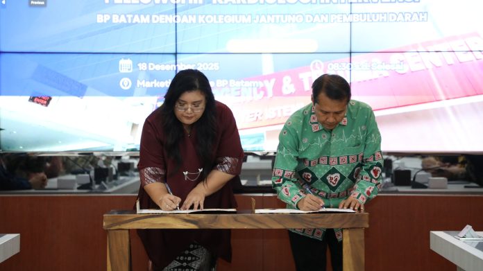RSBP Batam menandatangani Nota Kesepahaman (MoU) dengan Kolegium Jantung dan Pembuluh Darah untuk menjadi penyelenggara program Fellowship Kardiologi Intervensi di Marketing Centre BP Batam, Kamis (18/12/2025). (Foto: bp batam)
